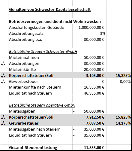 In der laufenden Besteuerung führt diese Konstellation zu einer Steuerentlastung von EUR 11.835. Grund für diese hohe Steuerentlastung ist, dass die Mietausgaben auf Ebene der operativen GmbH zu einer Steuerentlastung i.H.v. 30 % (grds. Steuersatz einer GmbH) führen. Auf Ebene der die Immobile haltenden Schwestergesellschaft werden die Mieteinkünfte jedoch lediglich mit 15,825 % besteuert.